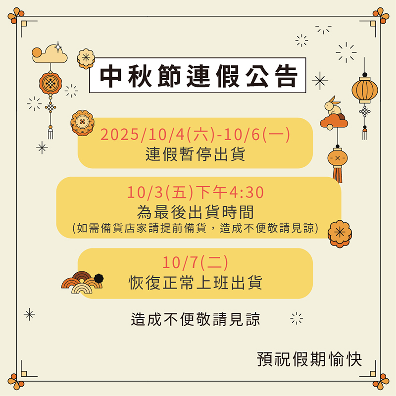出貨時間 : 周一至周五 (假日/國定假日 不營業)