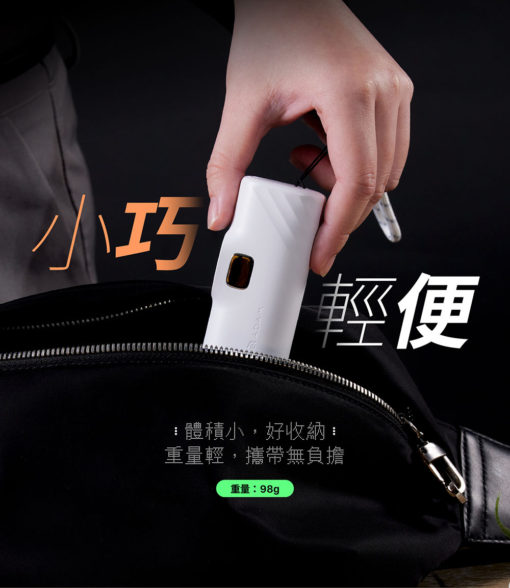 - 小巧體積,約一支口紅的長度,重量不到100g,輕便好攜帶,放口袋也無負擔。