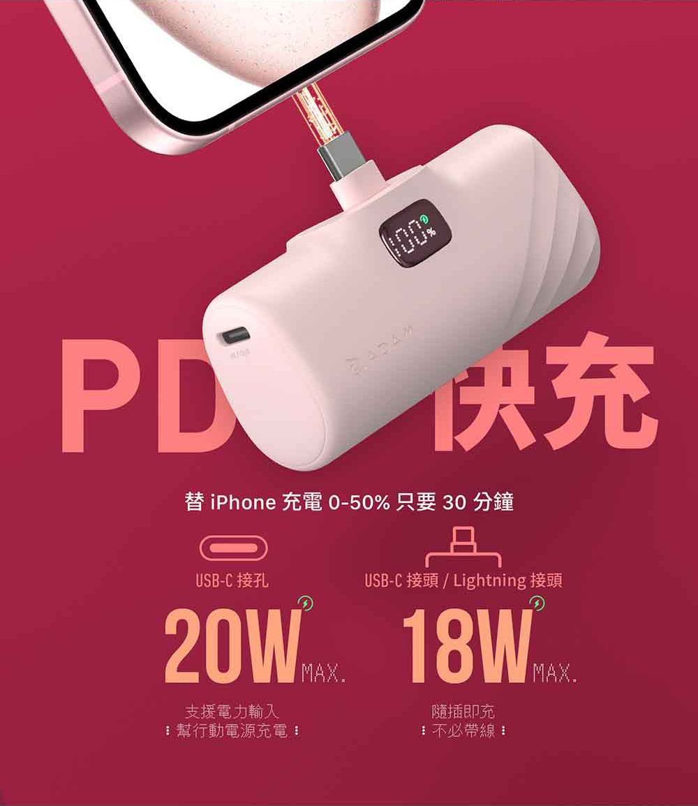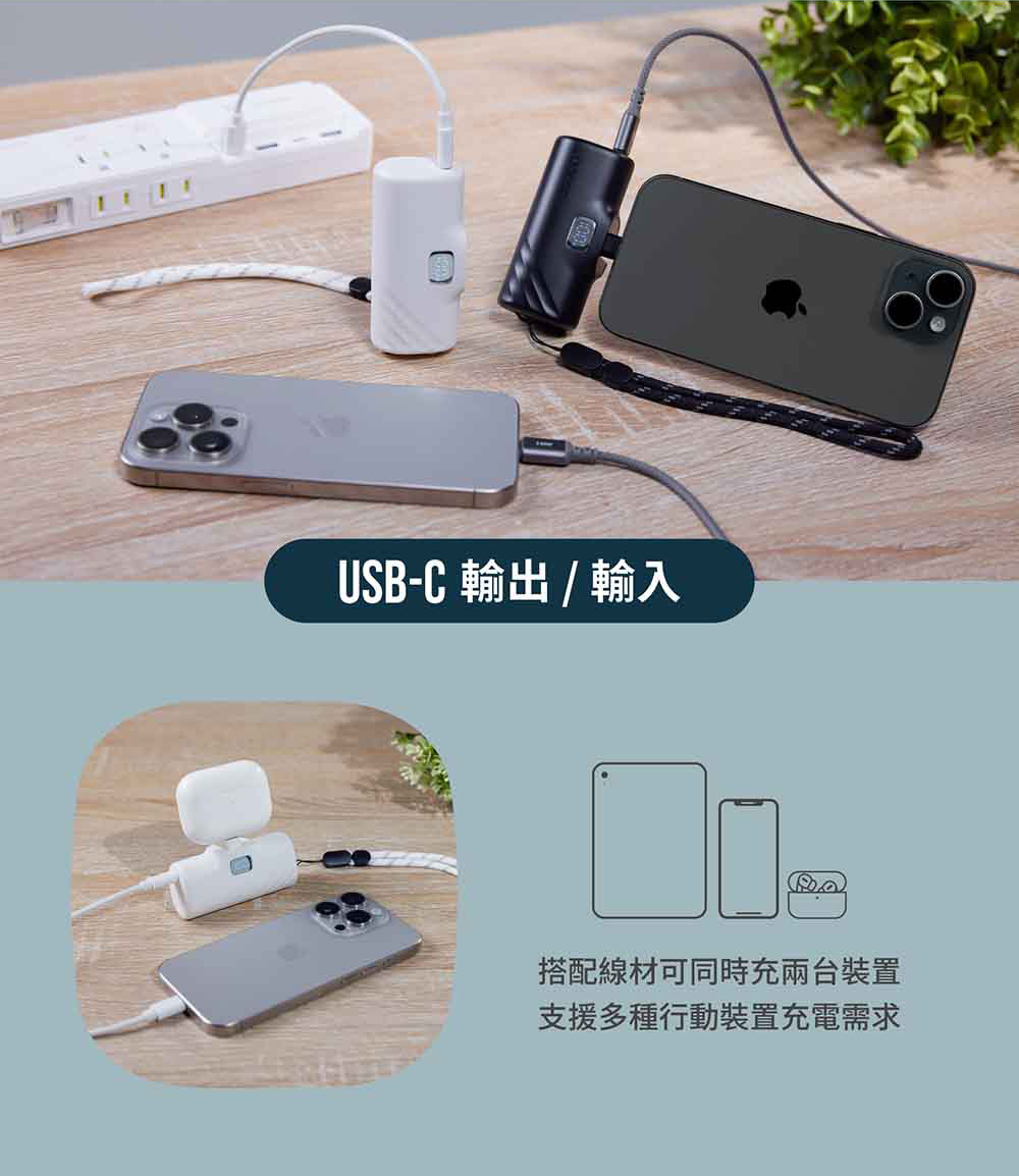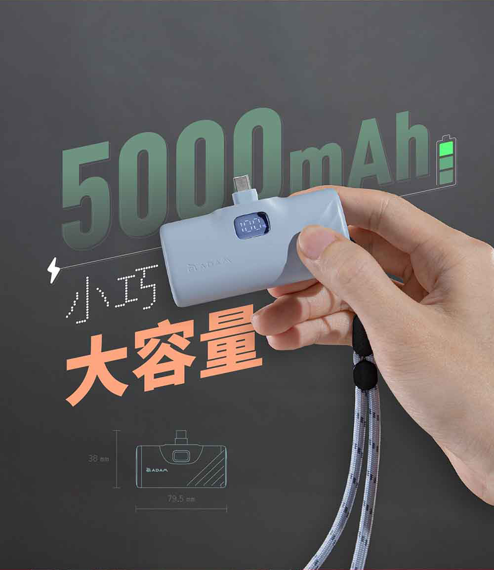 - 5000 mAh 行動電源,支援快充,可同時支援兩個設備充電,單孔最高輸出可達20W 。