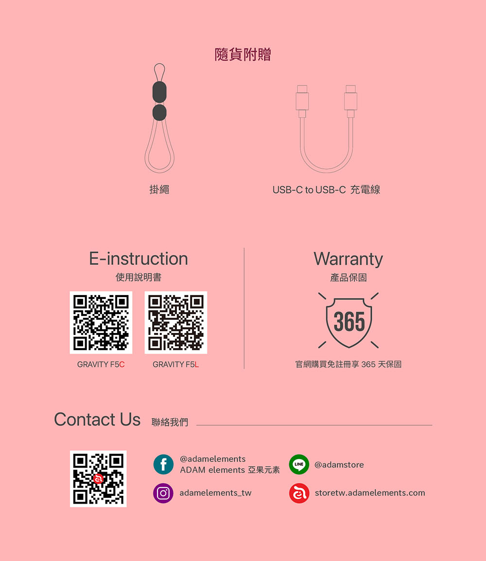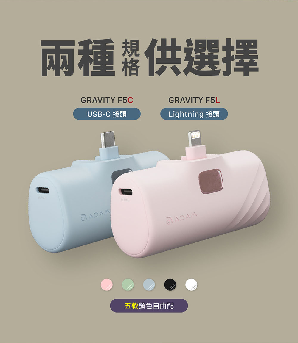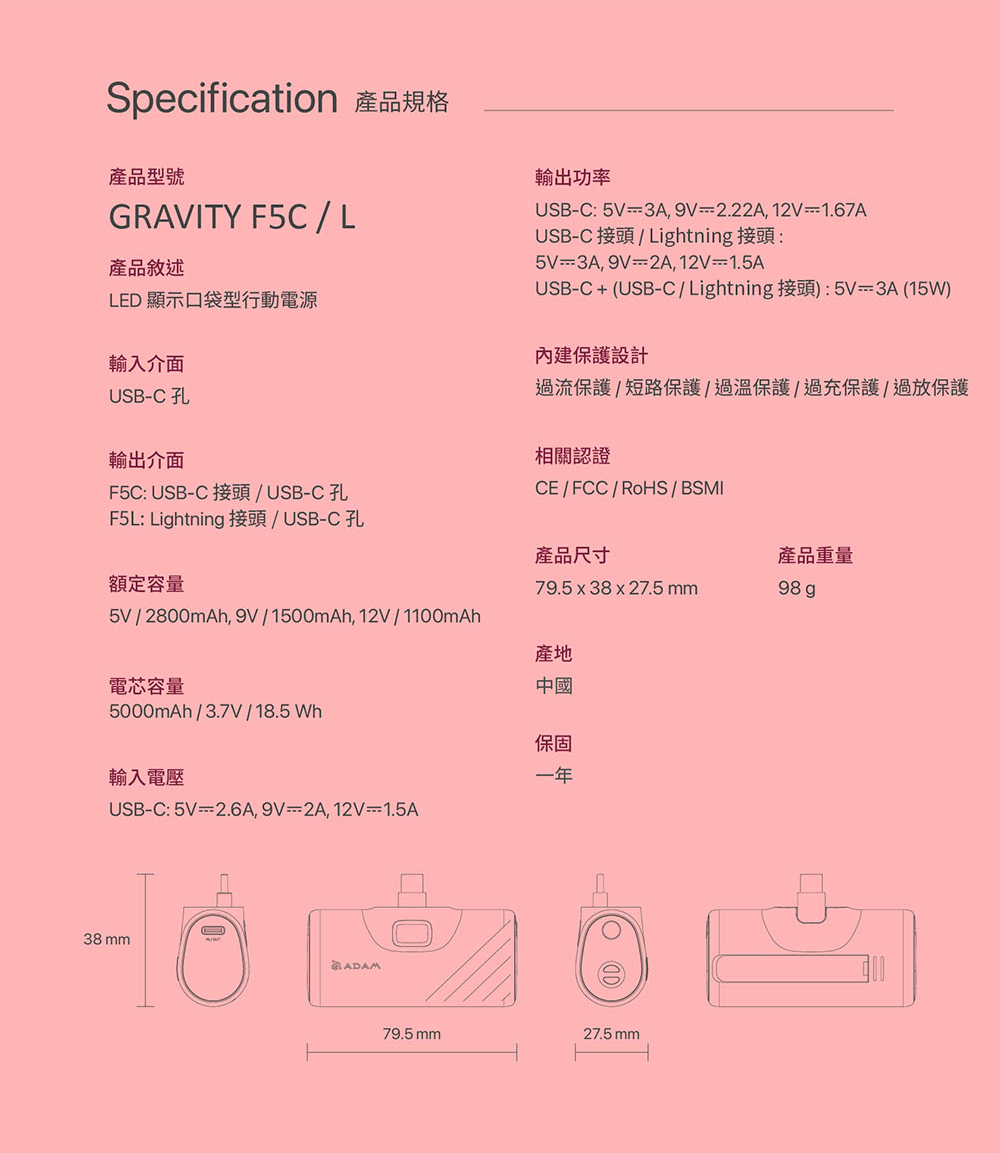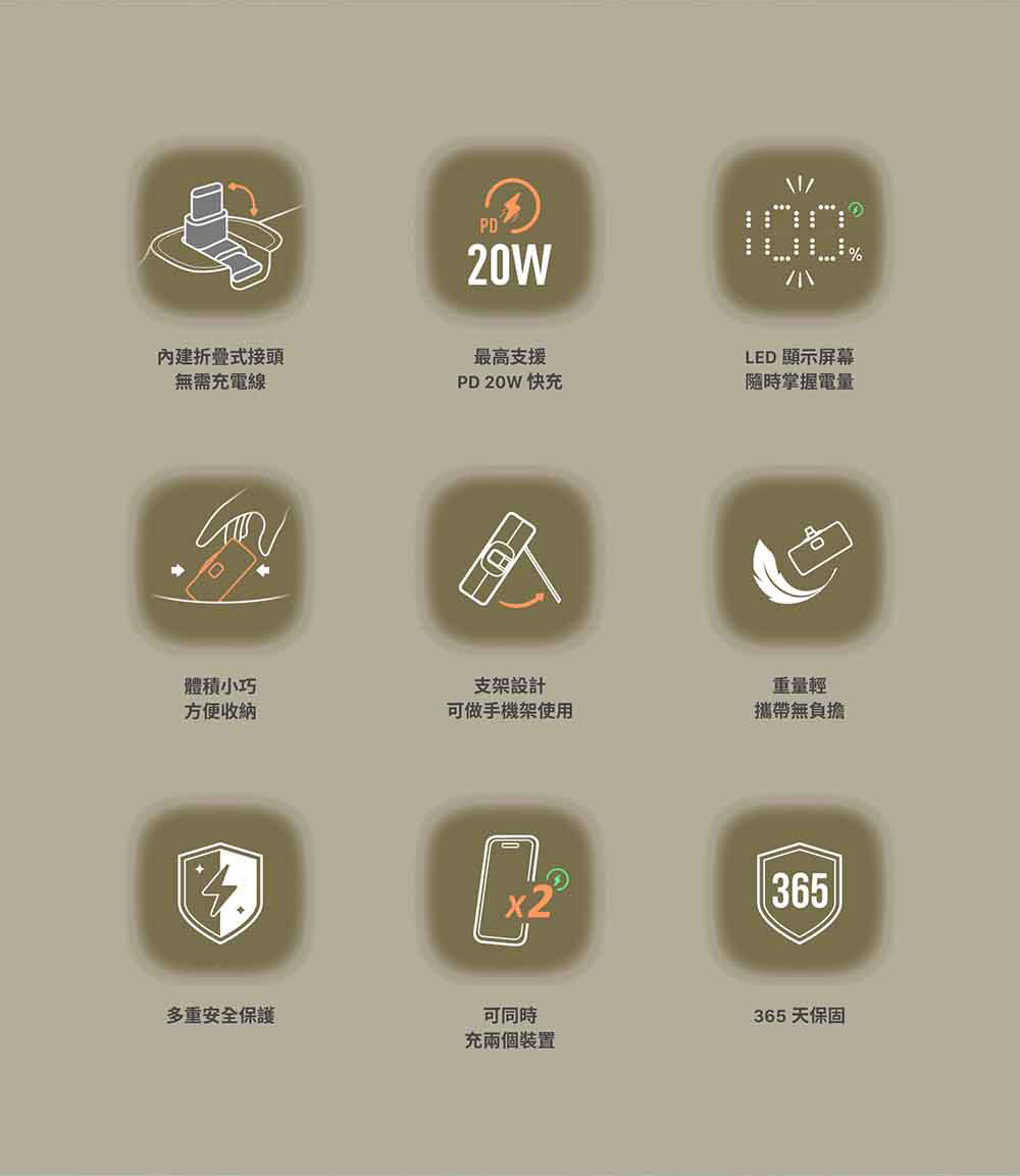 - 5000 mAh 行動電源,支援快充,可同時支援兩個設備充電,單孔最高輸出可達20W 。