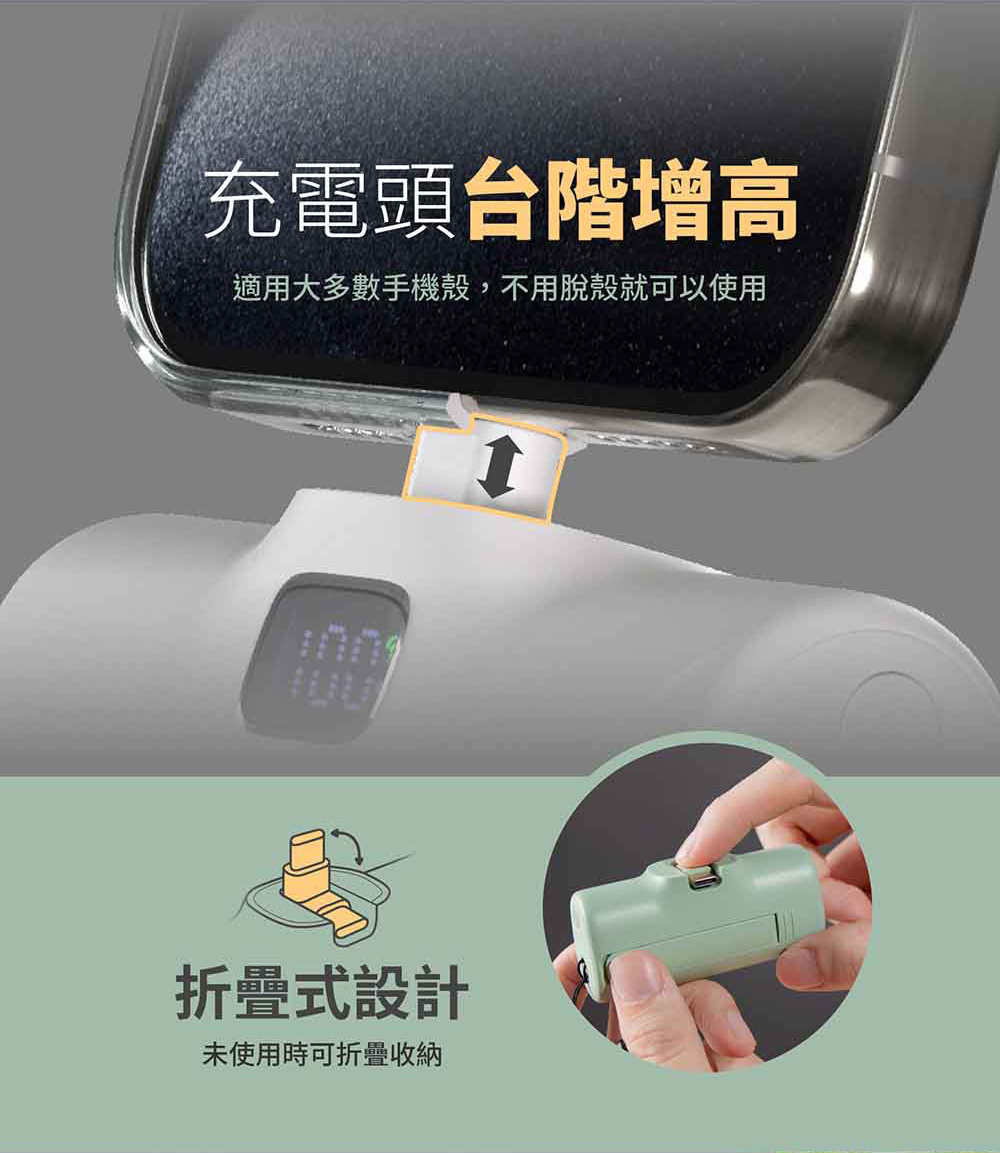 - 獨特可折疊接口,無需自備充電線材,即插,就來電,隨時支援設備充電。