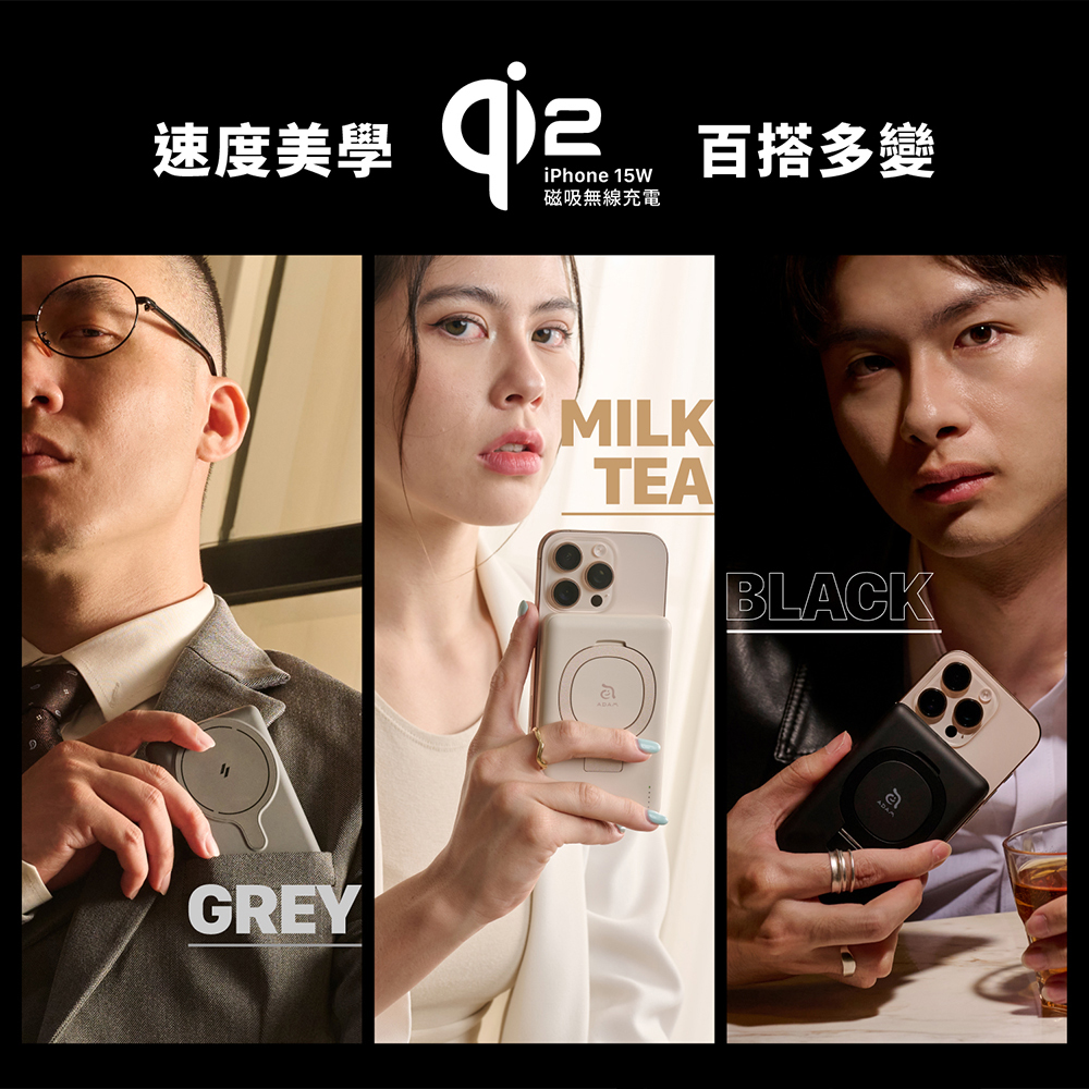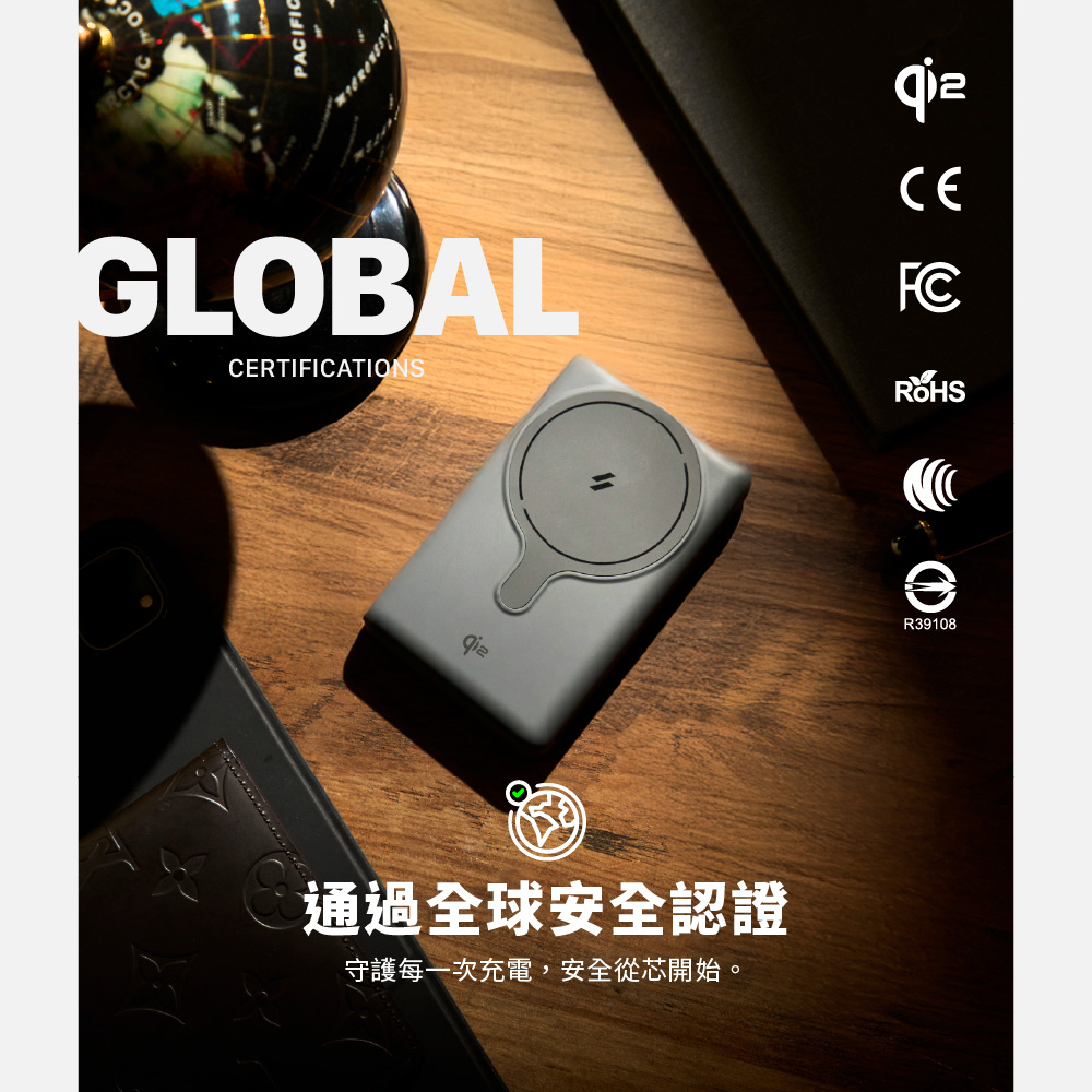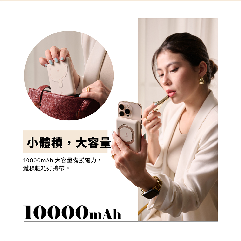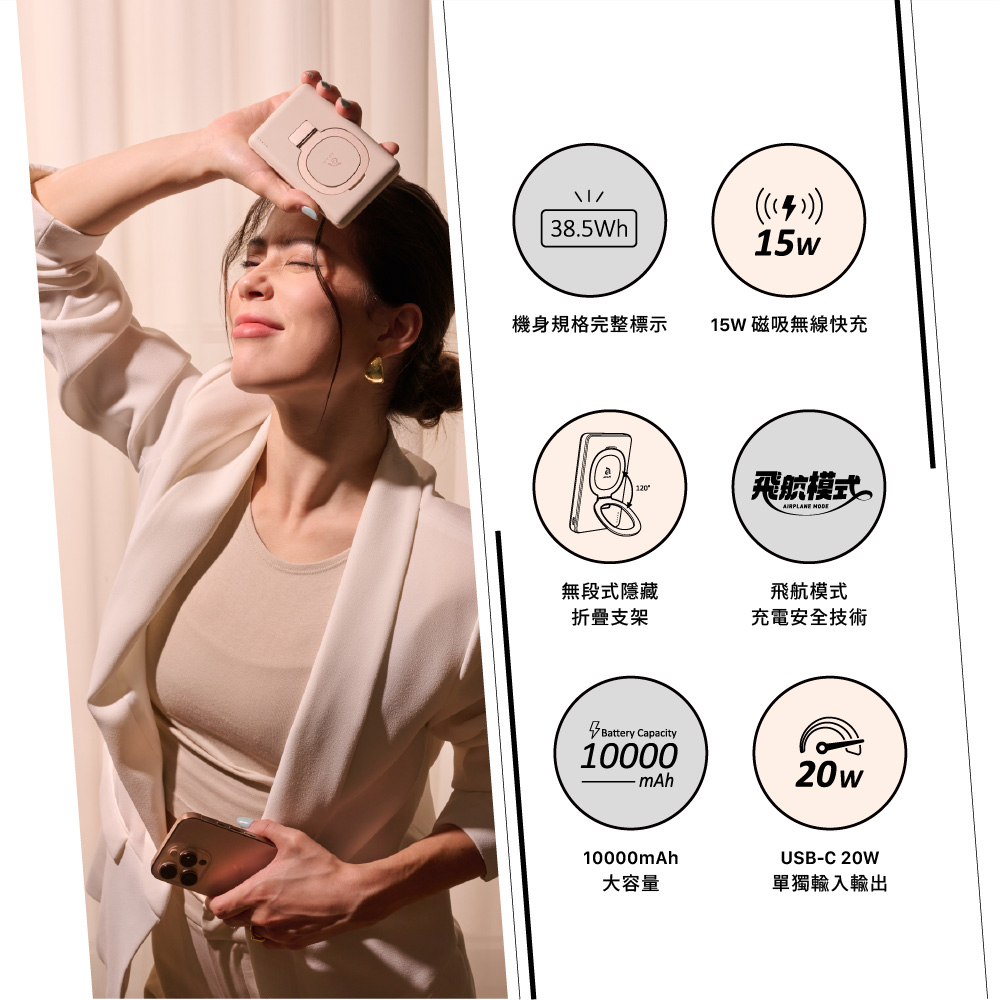 - 10000mAh 行動電源,並通過無線充電聯盟WPC認可之Qi2充電標準,磁吸充電iPhone最高可達15W。