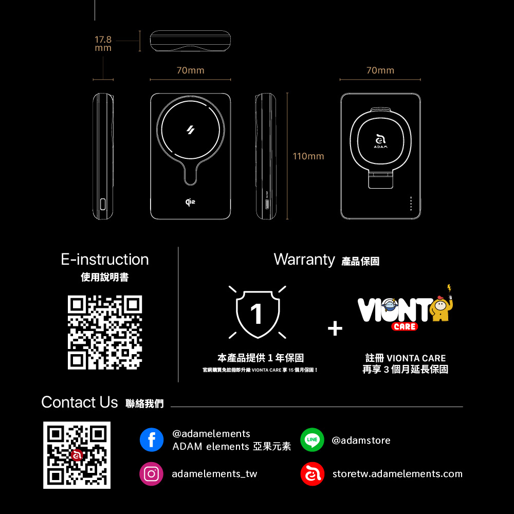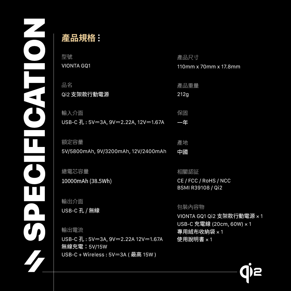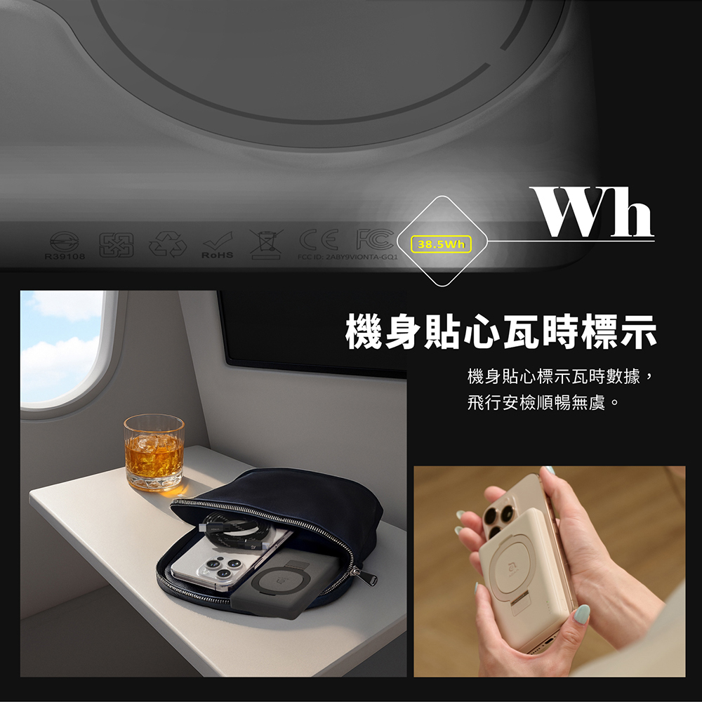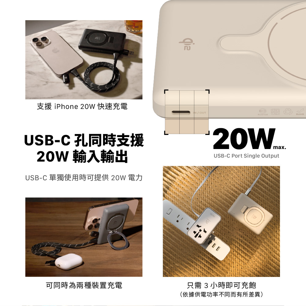 - 10000mAh 行動電源,並通過無線充電聯盟WPC認可之Qi2充電標準,磁吸充電iPhone最高可達15W。