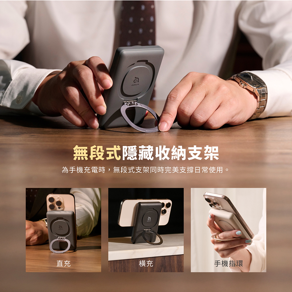 - 隱藏式收納支架,一邊幫行動電源充電還可當手機支架使用。