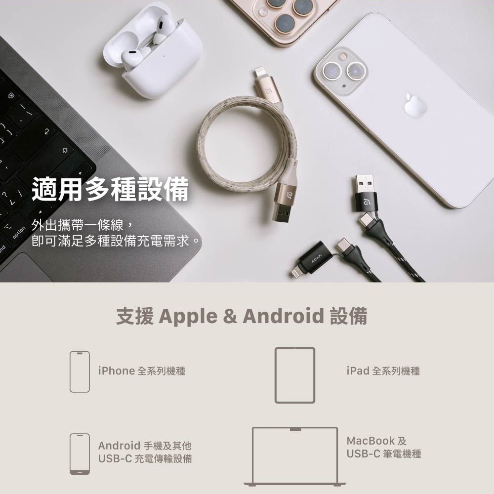 - 支援iPhone 15 (or later)、Andriod 裝置、iPad Pro 11"/12.9" (2018 or later)、iPad Air 4 (2020 or later)、iPad 10 (2022 or later)、iPad mini 6 (2021 or later)、MacBook Air、MacBook Pro 13"、筆電(最高支援60W)。