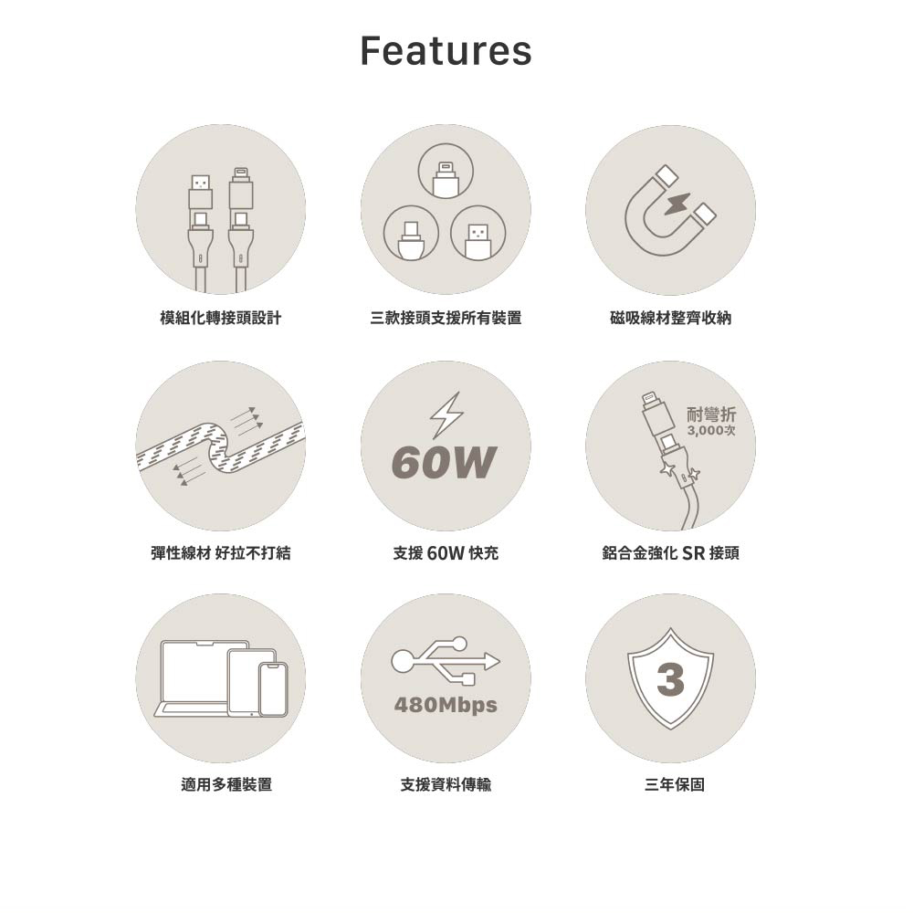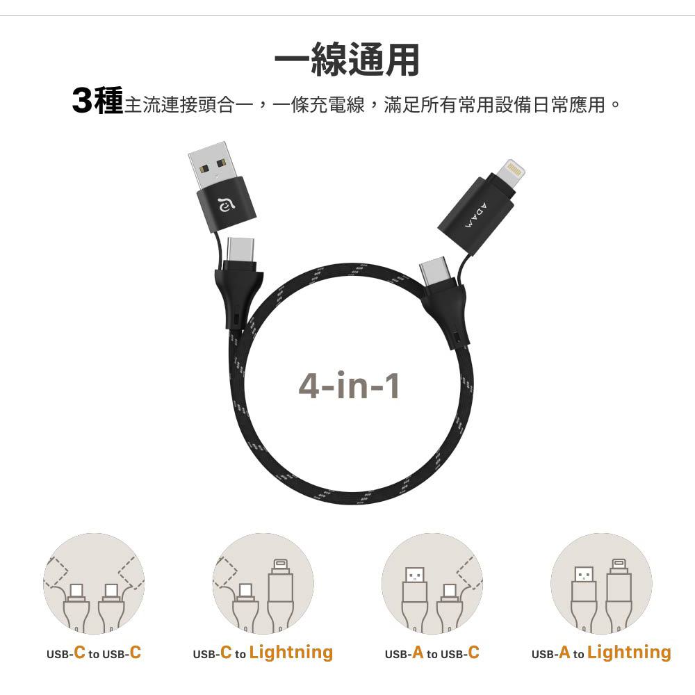 - 同時具備 USB-C、USB-A 與 Lightning 三種連接介面,滿足多元裝置需求,提供最全面且便利的使用體驗。