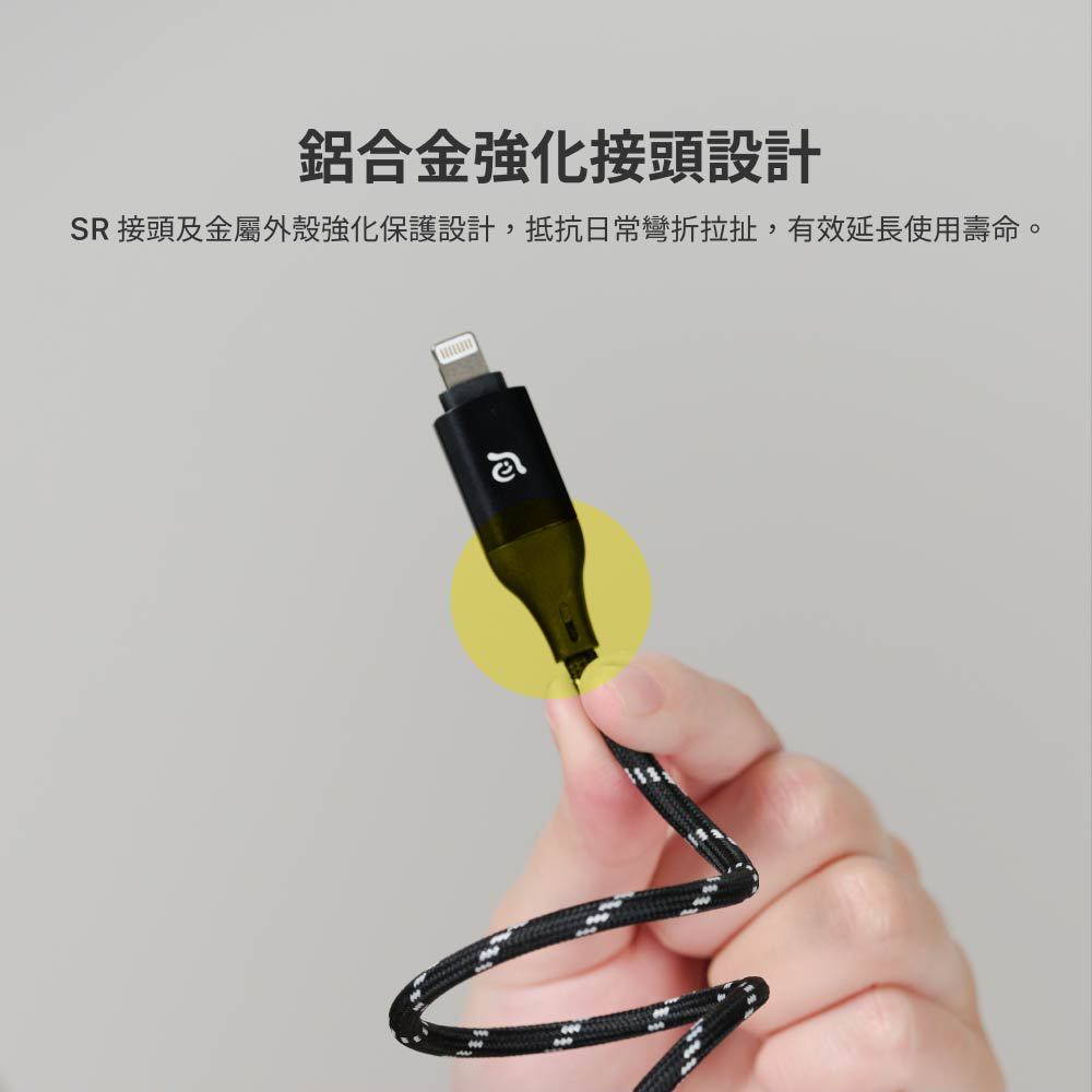 - 金屬材質的鋁殼及SR接頭強化設計,有效延長產品壽命。獨特柔軟尼龍編織線材,可靈活使用不易打結且耐用。