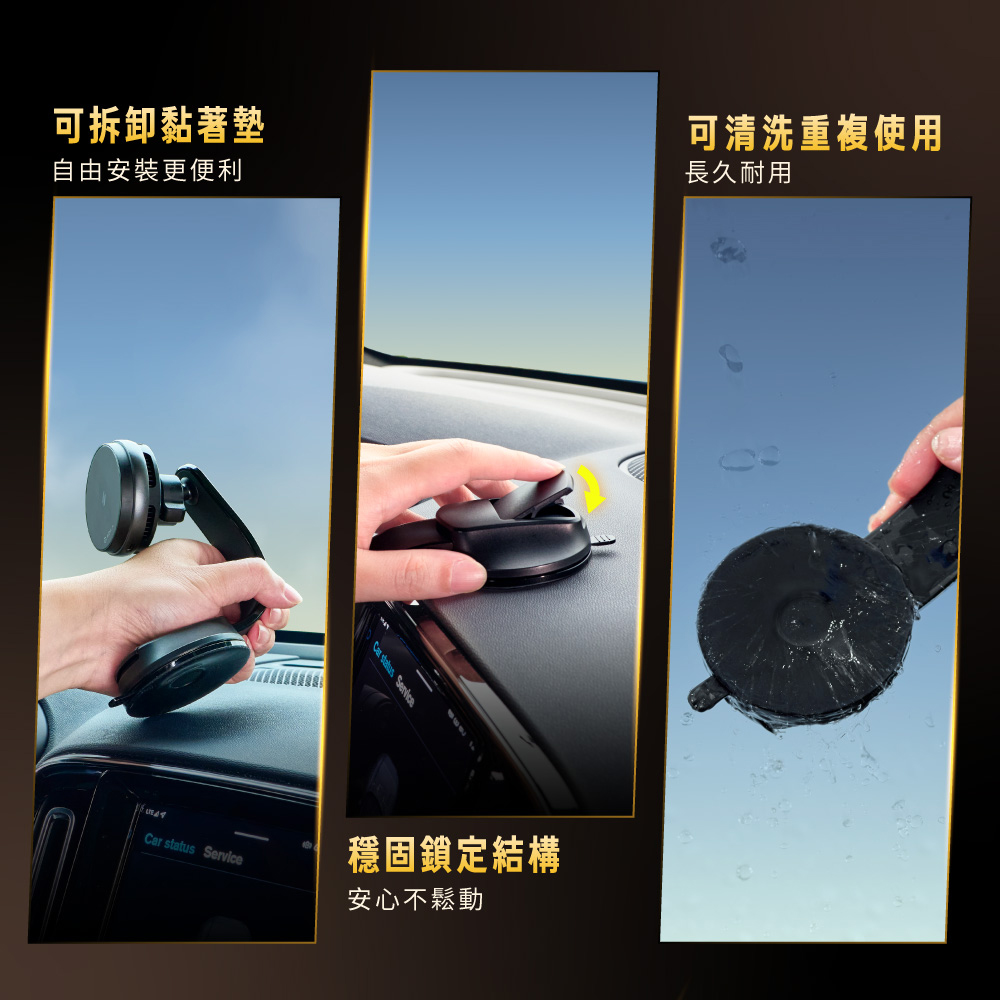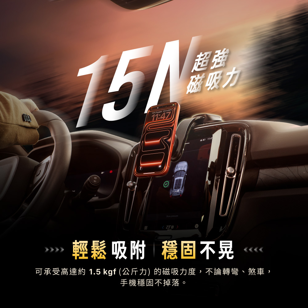 - 超強吸附可承受高達1.5公斤力磁吸力度,不論急彎,煞車等駕車狀態,手機都能穩固不掉落。