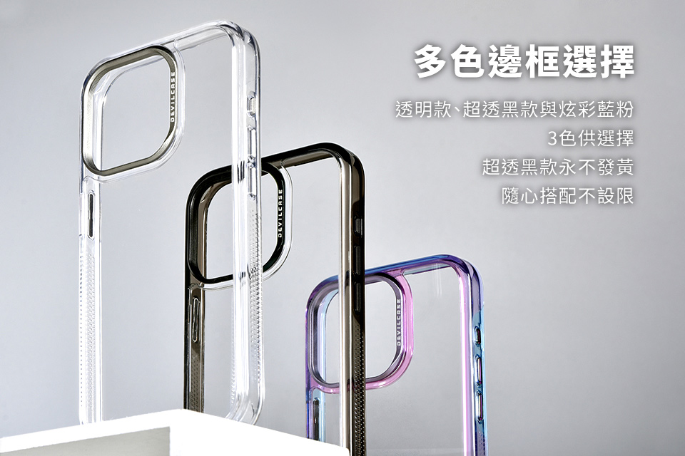 多色邊框選擇:透明款、超透黑款與炫彩藍粉(超透黑款永不發黃)