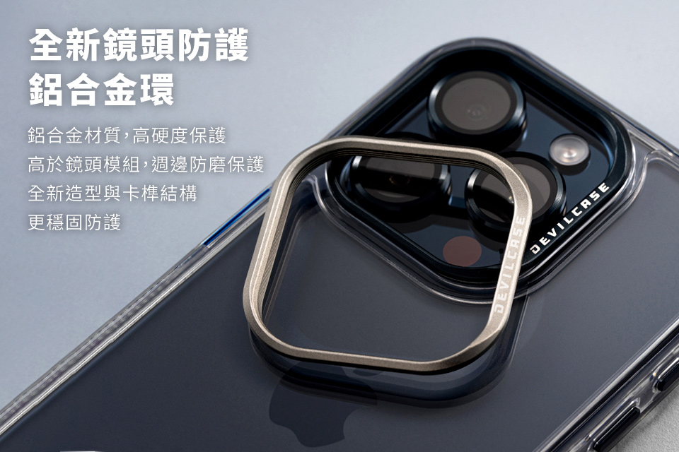 全新鏡頭防護鋁合金環:鋁合金材質,高硬度保護,高於鏡頭模組,週邊防磨保護,全新造型與卡榫結構更穩固防護