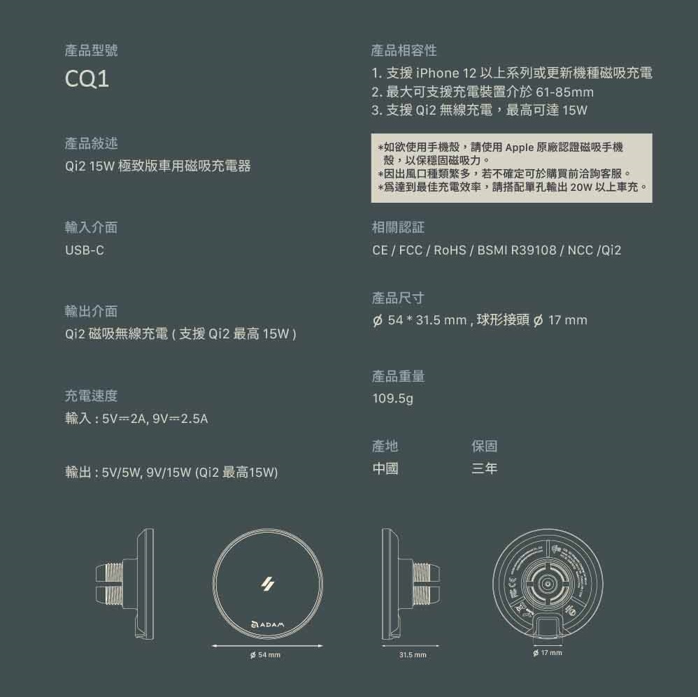 內容物:CQ1、萬向球型夾具、100cm USB-C充電傳輸線、對位卡、引磁環