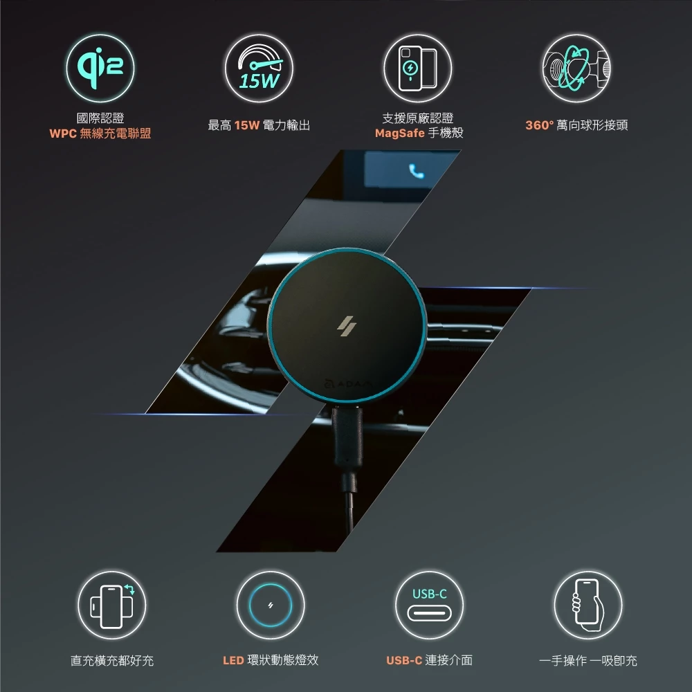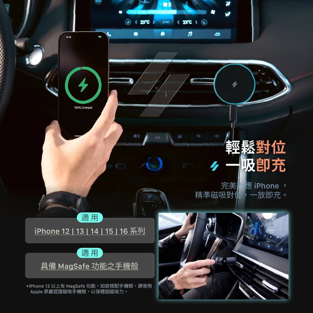 iPhone 12~16 全系列 MagSafe 適用,Android 裝置需搭配磁吸手機殼方可使用。